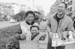 环卫工人康俊桥接过照片,举着让周围的人看,高兴地说:“瞧,我也挺漂亮的!”