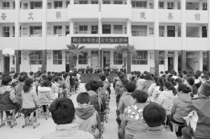 近日,市食品药品监督管理局工作人员走进川汇区韩庄小学,开展食品安全知识进校园宣传活动。图为工作人员在给小学生讲解食品安全知识。晚报记者 王凯 摄