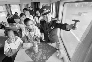 3月27日,兰州铁路局银川客运段乘务员(右一)在指导学生正确使用列车上的安全锤。