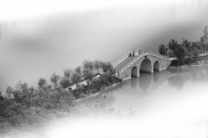 三槐桥拱高坡长,轮廓优美,与水中的倒影一起,诠释了什么才是真正的诗情画意。但是,若你眺望一眼,就此别去,无疑是一个不小的错误——距离产生了美有时也会疏远了美。且不说桥栏杆上所镌刻的古人咏槐的诗句多么芬芳,也不说三个巨大的孔壁上所描绘的图案多么意趣盎然,只你不踏上三槐桥就去不了七星岛,去不了七星岛,你就遗漏了整个槐园最值得驻足一赏的地方。
