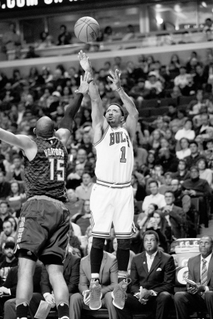 图为当日公牛队球员罗斯(右)在比赛中跳投三分球。
