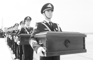 3月31日,在韩国仁川国际机场,中方礼兵手捧烈士遗骸。
