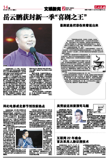本报综合消息 4月4日晚,东方卫视《欢乐喜剧人》第二季迎来总决赛,在撞脸男孩“小小岳”和师傅郭德纲的助阵下,岳云鹏以群口相声《今夜我们说相声》击败开心麻花夺得冠军,成为第二季“喜剧之王”。
