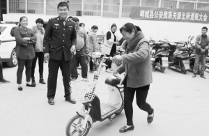 3月31日,郸城县公安局南关派出所进行公开退赃,失主推着被盗的电动车欣喜不已。