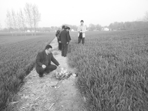 听完村民的讲述,几名男子走进麦田跪了下来。袅袅青烟升腾至半空中,寄托着他们对烈士的无限哀思。