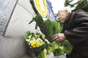 4月4日,南京大屠杀幸存者杨翠英在纪念馆遇难者名单墙前为当年遇难的亲人献花。