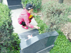 陵园里,周口纺织路小学三年级学生陈媛丽把散落在地上的小白花捡起来放到一处无名烈士墓墓碑前(图三)。“姥姥每年清明节都会带我来这个地方,让我学习烈士的精神,爱祖国、爱人民,好好学习。”陈媛丽告诉周口晚报记者,当天,她向烈士敬献了5朵小白花,在烈士陵园,她懂得了什么是烈士、什么是烈士精神。