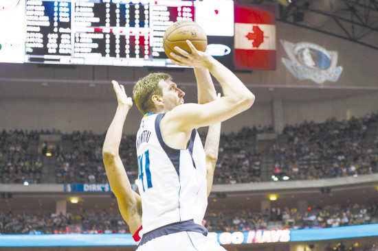 NBA常规赛 小牛胜火箭 当地时间4月6日,小牛队球员诺维茨基(前)在比赛中投篮。当日,在2015~2016赛季NBA常规赛中,达拉斯小牛队主场以88∶86战胜休斯敦火箭队。新华社发