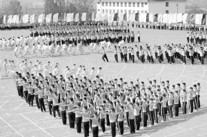 4月7日,在河南登封少林塔沟武术学校练功场,上课间操的学员进行队形变换。