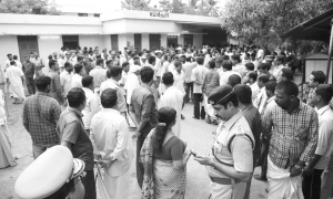 4月10日,在印度西南部喀拉拉邦,民众聚集在寺庙火灾事发地附近一家医院的太平间外。