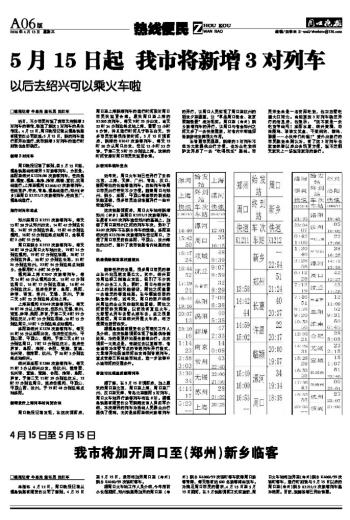 据了解,在5月15日调图后,加上原来的周口至北京、周口至上海、周口至广州、汉口至天津、青岛北至襄阳5对列车,周口火车站开行旅客列车将达8对。据漯阜铁路有限责任公司新闻发言人田红军介绍,本次增开的列车为沿线人民群众出行提供了便利,尤其是洛阳至绍兴旅客列车的开行,让周口人民实现了周口至杭州的朝发夕至愿望,让“早品周口美食、夜赏西湖美景”成为现实。周口至(郑州)新乡旅客列车的开行,让周口与省会郑州之间又多了一条快捷通道,对省内中短途探亲旅游将发挥很大作用。