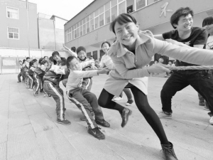 踩气球、双人赛跑、转呼啦圈、打乒乓球、拔河……为促进残疾学生健康成长,商水县日前为聋哑学生举办了一场丰富多彩的春季运动会。图为拔河比赛时的场景。