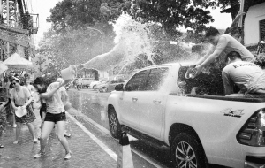 4月13日,在老挝首都万象,人们在街头向过往车辆泼水。