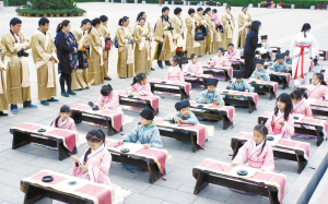 仪式现场,身着汉服的“萌娃”自正衣冠、师正衣冠、敬拜许慎后,依次上台,庄严地敲响三声“鸣志鼓”,敲响自己崭新的未来和希望,表达自己奋发学习的愿望。在老师的带领下,孩子们手执毛笔,在纸上书写一个简单而意义深远的“人”字,立志做一个堂堂正正、大写的人。接着,孩子们分别面向父母感恩鞠躬,为本次仪式画上一个完美的句号。随后,本报小记者及家长还参观了许慎文化园。