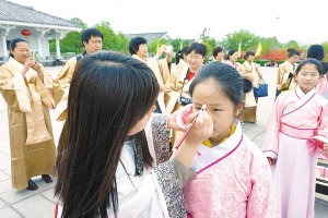 本报讯 4月17日上午,悠扬的古乐声中,本报小记者及家长50余人在漯河市许慎文化园参加传统形式的少儿启蒙“开笔礼”。老师用红色朱砂在孩子们的额头正中点上红痣,意为开启智慧,以此寄托美好愿望,愿孩子们从此眼明心亮、好读书、读好书。这是本报小记者赴漯河春游活动的一个精彩镜头。
