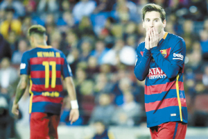 当地时间4月17日,巴塞罗那队球员梅西在比赛中错失进球机会。当日,在巴塞罗那诺坎普球场进行的本赛季西甲第33轮比赛中,梅西攻入职业生涯第500粒进球,但巴萨仍以1∶2不敌到访的巴伦西亚队。新华社发