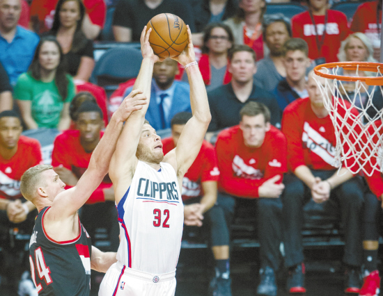 NBA季后赛 快船胜开拓者 当地时间4月17日,快船队球员格里芬在比赛中扣篮。当日,在2015~2016赛季NBA季后赛第一轮比赛中,洛杉矶快船队主场以115∶95战胜波特兰开拓者队。 新华社记者 杨磊 摄