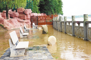 4月18日拍摄的被洪水围困的湖南衡阳石鼓书院景区亲水平台。