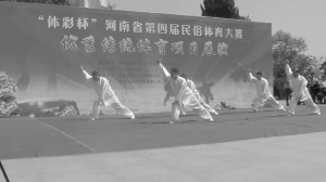 4月18日上午,河南省第四届民俗体育大赛在开封汴京公园拉开帷幕。我市心意六合拳协会代表队应邀参加优秀传统体育项目展演活动。他们先后演练了枪术、大刀、器械对练和集体十大形等5个项目,令观众大饱眼福。图为演练现场。