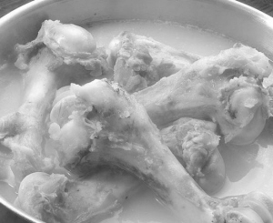 先要将猪骨过水一次:就是先烧一锅开水,将骨头放入煮10分钟左右捞出。用冷水冲洗掉骨头表面的血末,但是注意不要把骨头里面的骨髓洗掉了。