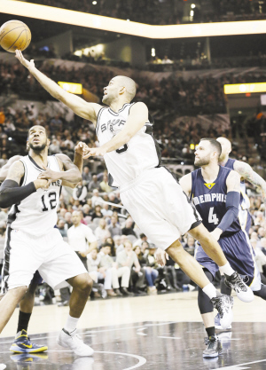 当地时间4月19日,马刺队球员帕克在比赛中上篮。当日,在2015~2016赛季NBA季后赛第一轮比赛中,圣安东尼奥马刺队主场以94∶68战胜孟菲斯灰熊队。