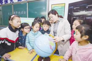 4月20日,在合肥市嘉和苑小学内,科学老师焦燕(右三)给学生介绍地球的结构。