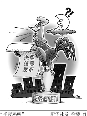 小汽车“限购”政策晚间“空降”,热点新闻事件调查进展发布拖至半夜……近年来,对于公众关注度较高的热点信息,一些部门和地方往往选择在深夜发布,颇有“半夜鸡叫”的味道。