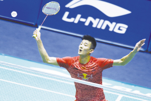 4月21日,中国选手谌龙在比赛中回球。当日,在江苏省常州市举行的2016中国羽毛球大师赛男子单打比赛中,中国选手谌龙以2∶0战胜队友石宇奇,晋级下一轮。