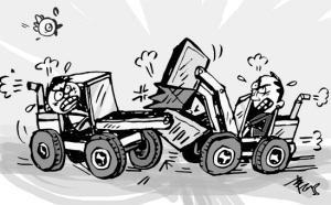 铲车是工程能手、拆迁利器,车前那满是獠牙的铲子,上下前后收缩摆动,已初具未来科技工程的智能风范,令人敬畏。但就像《植物大战僵尸》里的巨型机器,虽威风凛凛,控制它们的却是坐在驾驶室里的一个小小的僵尸博士或他们的学生,铲车的爱恨情仇,都由它们的主人决定。若无意外发生,铲车们该干活时干活,干完活歇在停车场,相看两不厌,岁月亦颇静好。没想到主人间的岁月不静好,铲车友谊的小船遂说翻就翻。