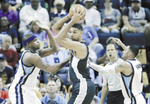 当地时间4月24日,马刺队球员邓肯(左二)在比赛中进攻。当日,在2015~2016赛季NBA季后赛首轮第四场比赛中,圣安东尼奥马刺队客场以116∶95战胜孟菲斯灰熊队,以4∶0的总比分晋级西部半决赛。