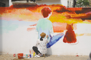 4月25日上午,在周口中心城区太昊路阳光花墅小区,绘画人员认真在墙体上绘画。据了解,该小区的围墙长达千米,为了让墙面更富有艺术气息,小区请来众多绘画高手,在千米长墙上绘出百幅风格各异的风景画。
