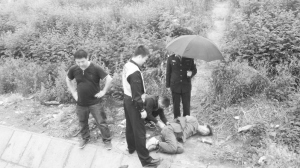 高速交警赶到时,小偷手持水果刀已从车上下来,被乘客围在中间。眼看要被抓,小偷强行冲出人群向服务区护栏外跑去。张国良、方磊峰和部分乘客立即追赶。追到高速公路护坡处时,一名乘客将小偷扑倒在地,将其控制(如图)。