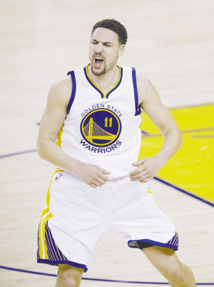 当地时间4月27日,勇士队球员汤普森庆祝得分。当日,在NBA季后赛第一轮第五场比赛中,金州勇士队主场以114∶81战胜休斯敦火箭队,以总比分4∶1晋级西部半决赛。
