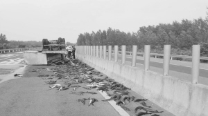 本报讯 5月1日, 一辆运输鲟鱼的货车行驶至商周高速公路161公里(北半幅)处时,突然爆胎翻车,数百条鲟鱼全部随水“跑”到路面上(如图)。市交警支队高速事故大队民警和巡逻至此的市交警支队商周高速大队外勤民警兵分两路,一路迅速勘查和清理事故现场,一路疏导过往车辆减速行驶。16时10分许,道路恢复正常通车。