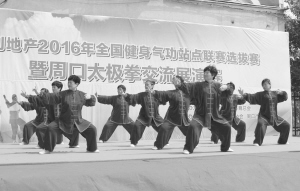 “五一”假期的第一天,“2016年全国健身气功站点联赛(周口赛区)选拔赛” 在周口市区佳利广场举行(如图),来自周口中心城区的15支代表队210多人参赛。最终, 人民公园队、文昌大道队、夕阳如梦队获得前三名。他们将代表周口市参加我省东部赛区站点联赛,若再获佳绩,就将赢得参加省、国家级站点联赛的机会。 同一天,“2016年全民健身月周口市太极拳团体交流展演赛”也在佳利广场亮相,中心城区的16支代表队230多人参赛。