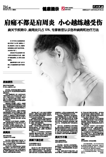 黄长明特别提醒,对于非肩周炎的患者,需要的不是锻炼,而是要休息。他说,肩关节疼痛或者功能受限,超过1个月没有好转,或者反而加重,则需要来医院检查。
