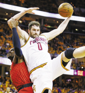 当地时间5月4日,骑士队球员勒夫与老鹰队球员米尔萨普争抢篮板球。 当日,在2015~2016赛季NBA季后赛东部半决赛第二场比赛中,克利夫兰骑士队主场以123∶98战胜亚特兰大老鹰队,总比分2∶0领先。新华社发