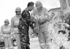 5月7日,专业消防人员(前左)在对拉萨市拉鲁社区义务消防队进行指导。