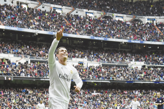 西甲联赛 皇马胜巴伦西亚 当地时间5月8日,皇马队球员克·罗纳尔多庆祝进球。当日,在2015~2016赛季西班牙足球甲级联赛第37轮比赛中,皇家马德里队主场以3∶2战胜巴伦西亚队。 新华社发