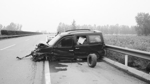 当日5时20分,一名司机向市交警支队高速交警值班室报警称:在宁洛高速449公里处(北半幅),一辆面包车撞上护栏后横在路面上(如图)。市交警支队高速事故大队值班交警王光明和刘杰迅速赶到现场,看到一辆面包车撞击中央隔离护栏后横在路上,车头严重凹陷,两名乘车人面部受伤。