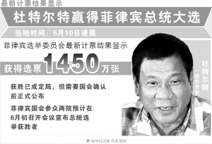菲律宾选举委员会5月10日凌晨公布的初步选举结果显示,达沃市长杜特尔特在菲总统选举中获得1450万张选票,获胜几乎已成定局,但需国会确认后正式公布。