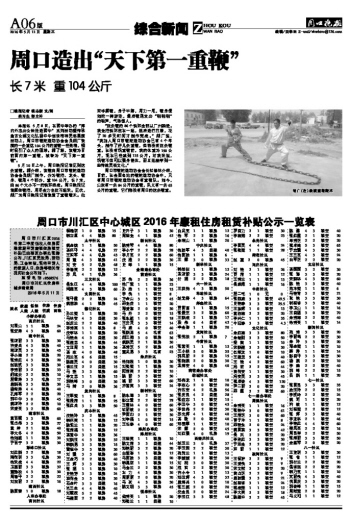 周口市川汇区中心城区2016年廉租住房租赁补贴公示一览表