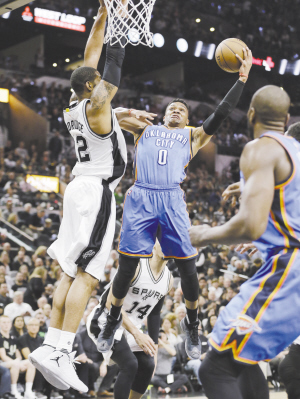 当地时间5月10日,雷鸣队球员威斯布鲁克在比赛中突破马刺队球员阿尔德里奇的防守上篮。当日,在2015~2016赛季NBA季后赛中,圣安东尼奥马刺队主场以91∶95不敌俄克拉荷马雷鸣队。