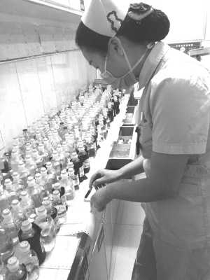 一进入治疗室,记者就看见一张长约4米、宽约0.5米的桌子上,规规矩矩摆放着各种各样的药品,一旁还有一些单据,记录着病人所需要的药品,护士要根据这些单据给病人配药。为了不打扰护士工作,记者便站在治疗室外面,远远地看着她们工作,而这一等就是1个多小时。