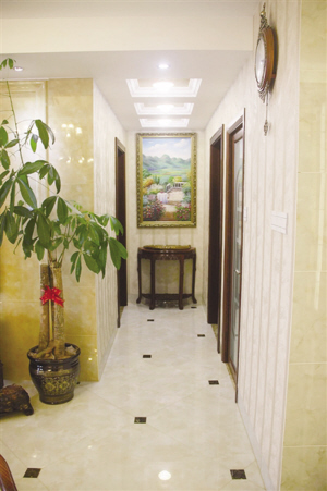 油画的多彩点缀了米黄色地砖、壁纸为主的过道,走廊吊顶上,王先生更是走访了很多灯饰城,不计成本地挑选了吊灯,使得走廊更加大气美观。