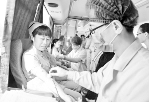 5月12日,河间市人民医院护士苏雪地(左一)在献血车上参加无偿献血活动。