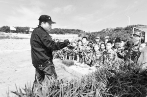 5月18日,在威海市中小学生综合实践教育中心,老师在向威海九中的学生讲授如何插秧。
