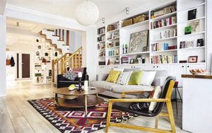 借鉴:客厅的沙发背景墙实际可以大有作为,一组书柜对客厅的宽度并没有太多影响,也打破了通常意义上的功能定位,把阅读和工作的功能与客厅融合起来,让家看起来具有书香气。(壹零)