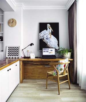 雅雅的家是一所复式公寓,在一层,设计师将阳台纳入室内,整体空间更为开阔,采光也更加通透。阳台由落地窗代替,落地窗前,靠墙放置了简单的工作台。在和会客区相接的地方,设计师采用了一组矮柜,保留了阅读工作区的私密空间,增加了收纳空间。这个角落靠近窗户,可以供主人处理简单的工作事务,也可以作为阅读空间,当家里人比较多,这里也可以临时坐一下,形成围合空间。