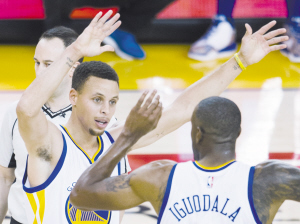 当地时间5月18日,勇士队球员库里(左)和队友伊戈达拉庆祝得分。当日,在2015~2016赛季NBA季后赛西部决赛第二场比赛中,金州勇士队主场以118∶91战胜俄克拉荷马雷鸣队,将总比分扳成1∶1。新华社记者 杨磊 摄